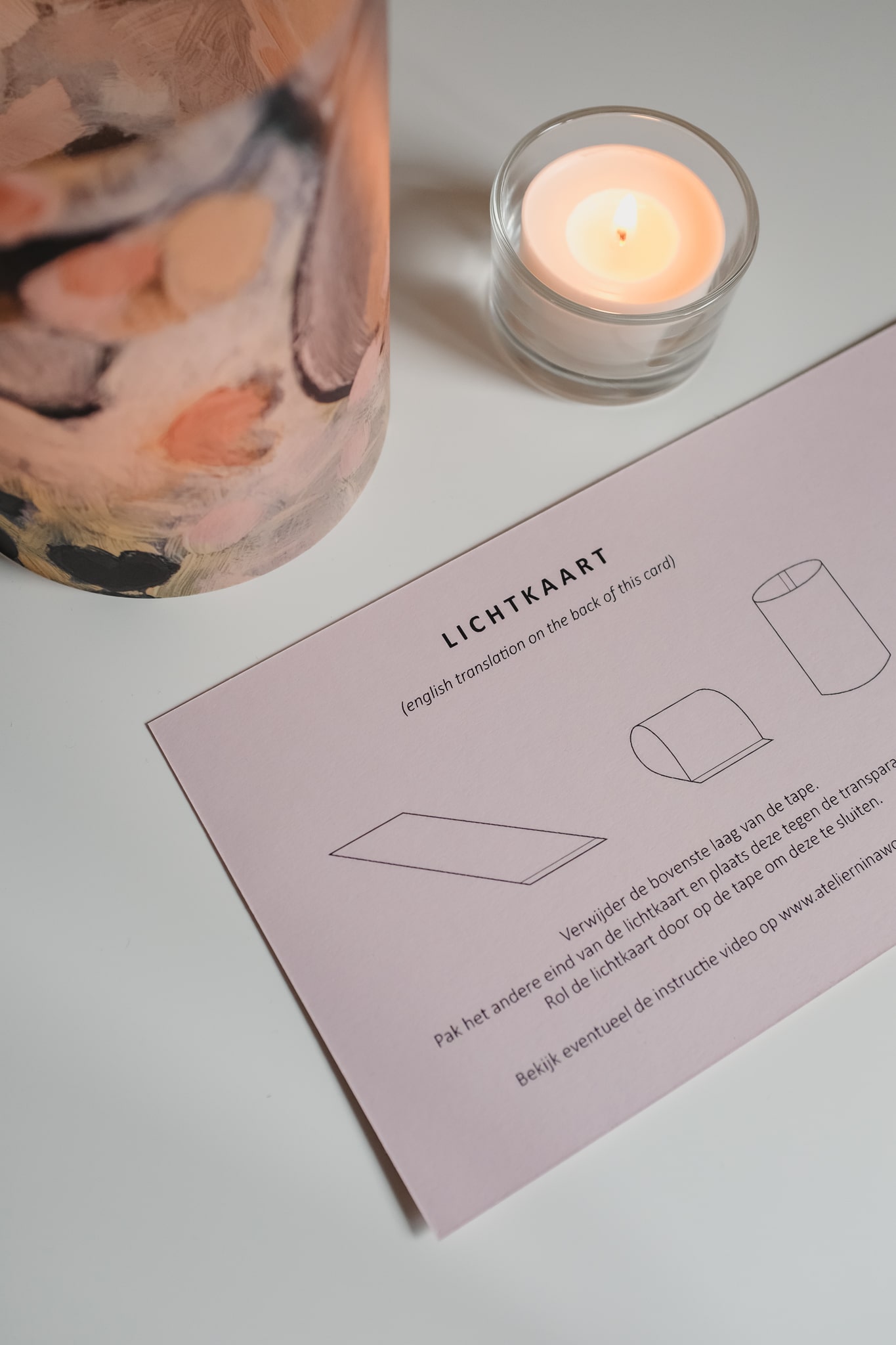 Een prachtig kunstwerk in de vorm van een kleine lantaarn. Deze lichtkaart brengt warmte en troost in elke woonkamer. Dit product is met veel liefde gemaakt in Utrecht door Atelier Nina Wormer.